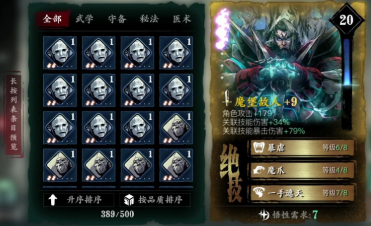 魔堡故人的强度主要体现在它的绝技效果上。第一个绝技暴虐能按百分比提升攻击力,每升一级加成更高,后期堆起来收益非常可观。第二个绝技魔爪则是实战神技,释放关联技能时会召唤魔爪聚怪并控场,无论是清小兵还是打BOSS都很实用。升到紫火后还能解锁腐蚀效果,进一步削弱敌人。所以拿到这本心法后,咱们得优先培养它的绝技等级,尤其是第一个加攻击的绝技。
