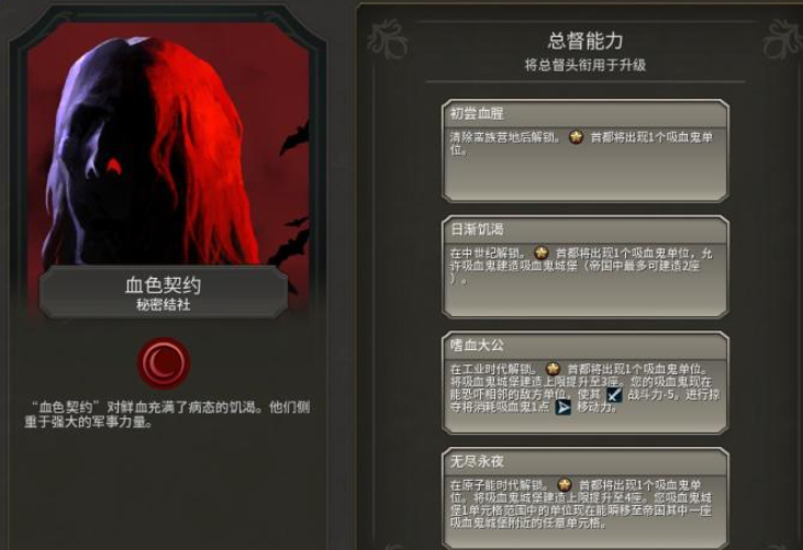 加入结社后会解锁专属总督,用总督点数可以逐步升级结社能力。每个结社的升级效果都很独特,比如夜鹰的间谍加成、黄金黎明的伟人强化、虚空吟唱者的邪教徒单位以及血色契约的吸血鬼城堡。需结社一旦选择就无法更换,所以要根据自己的玩法谨慎决定。