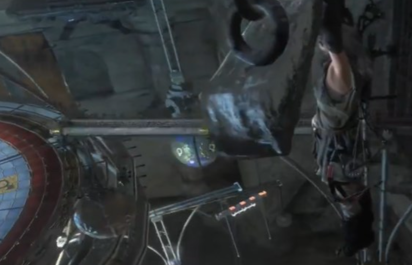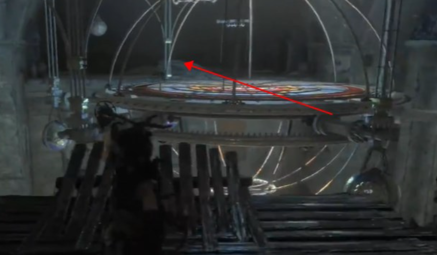 来到上方平台后,推动轨道上的装置解开第一道锁,接着跳到另一侧平台重复相同操作解开第二道锁。全部解锁后整个太阳系仪会开始旋转,这时要用钩索荡到中央平台。注意观察旋转节奏,当带有挂环的平台转过来时抓住时机跳上去,站稳后等待带有板子的平台转到合适位置再跳过去。这个过程需要耐心,不要急于跳跃。
