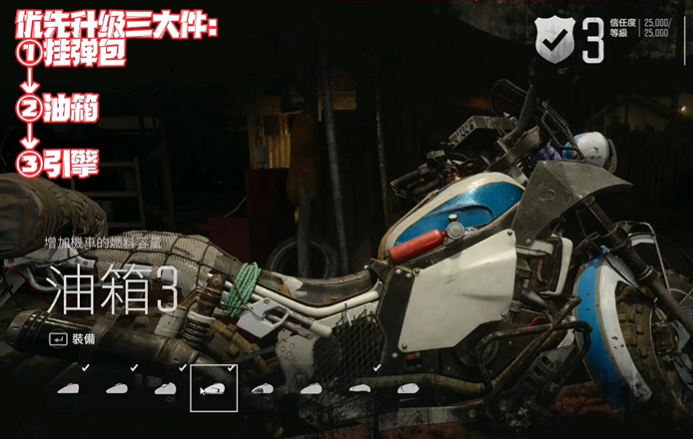 摩托车的强化是生存与探索的核心要素之一。优先升级油箱容量是基础策略,更大的油箱能显著扩展快速移动范围,避免频繁寻找燃料。引擎和氮气加速是中期关键升级,尤其在需要冲刺通过陡坡或摆脱追逐时不可或缺。排气管改造则能降低噪音,减少吸引敌人的风险。废铁作为通用维修资源应随时储备,尤其在野外遭遇战或长途旅行后需及时修复耐久度。