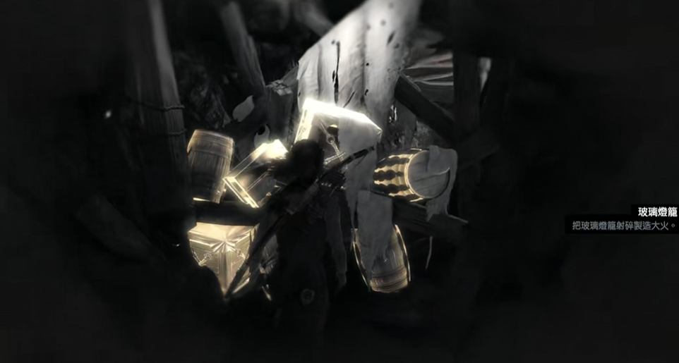 支线古墓是提升探索乐趣的重要环节,每个古墓都有独特的解谜机制。进入洞穴后先往左手边走,经木板爬上第二层石阶可以看到地下的三个灯笼,按E拿起扔到眼前裹有布条的木柱上。之后经机身跳过去另一面,用弓箭射下悬挂死尸头上的灯笼使木柱着火,再到木柱后面按F推倒引燃下一个木柱。要点燃最后一个木柱需要到刚进洞穴右手边的高地,把火盆射落后攀上货物堆抓住横木,让火盆摆荡至对面点燃货物,大火会通过细线点燃最后一个木柱。飞机坍塌后回到刚开始左手边位置,用最后一个灯笼烧掉机身内货物腾出空位,就能沿机身上去获得大秘宝。