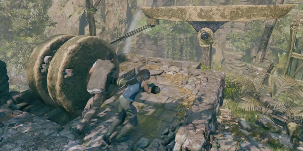 石轮推到顶后会触发限时机制,这时候动作要快。立刻从右侧跳到下面一层,瞄准降下来的绳桩和对岸断桥上的绳桩,用绳索箭矢把它们连接起来。如果耽误太久,绿色容器里的水会流走,就得从头再来。绳索连接成功后,伙伴会松手,木桥开始缓慢上升。