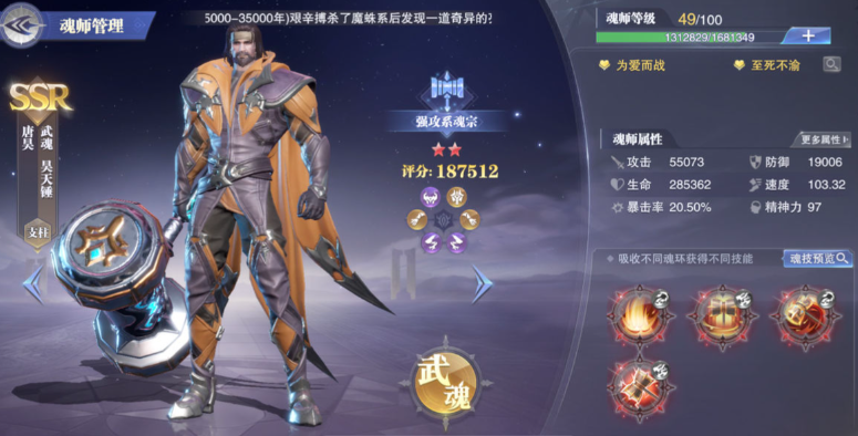 唐昊是邪月的理想搭档,巨蟹系二技能能在低血量时为邪月永久提升攻击力,狂猿魂骨进一步强化输出。鬼魅和宁荣荣能提供稳定的魂力恢复和行动条控制,确保邪月优先出手。如果遇到高防御敌人,可加入胡列娜或黄远,前者能附加重伤状态提升伤害,后者能提供暴击伤害加成。