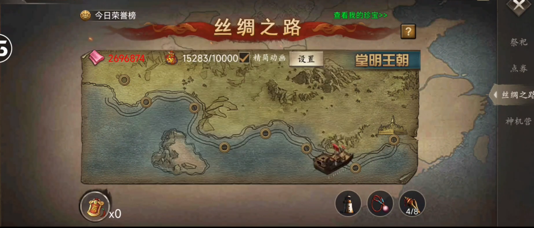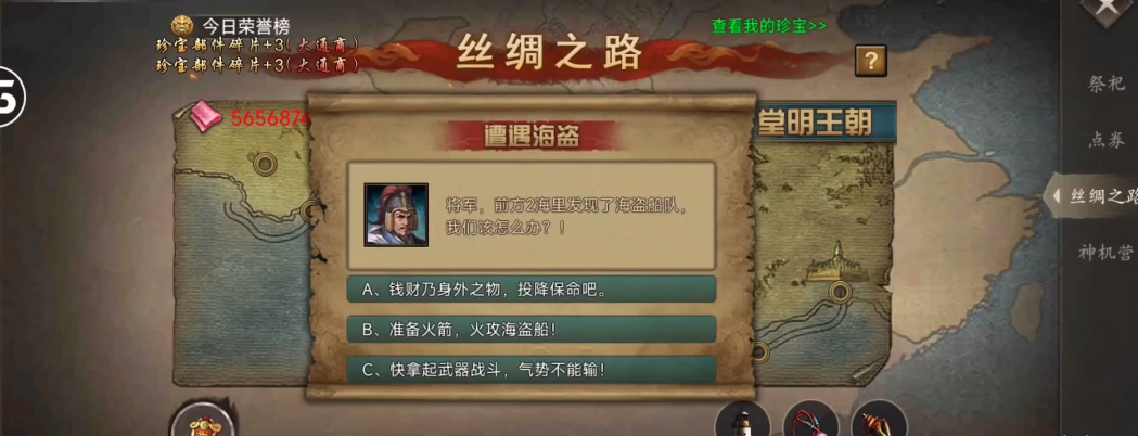 首先需完成171级主线任务并通关两次副本以开启御宝栏位。随后通过击败典韦获取御宝图纸,打造青铜剑。在此过程中,玩家需参与丝绸之路活动,通过派遣武将处理事件获取珍宝碎片。每完成一定数量的事件后可选择继续或重新开始,失败则需消耗资源重置。跑平原事件时,每趟可收获固定数量的资源,累计一定次数后可补齐所需碎片。