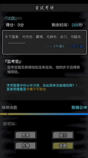 准备阶段一定要多刷书籍等级,尤其是论语大学这些经典。乡试时遇到不会的题可以搜一下答案,但别太依赖,毕竟省试和殿试更考验真实积累。省试前记得找教书先生买押题集,每场考试能用4次提示,比作弊安全多了。殿试的关键是审题,先琢磨清楚皇帝喜欢哪种风格,比如策论还是诗词,再动笔不迟。