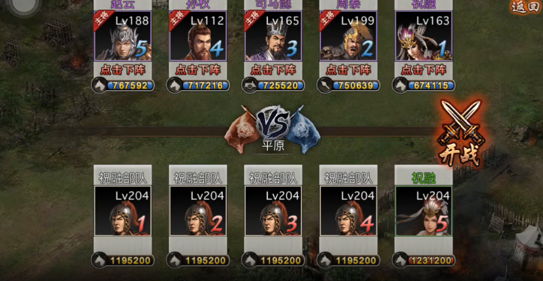 开局时应优先释放祝融的突击战法打击敌方前排,随后用孙策和甘宁集中火力消灭残血目标。吕蒙需及时使用防御技能保护队友,夏侯渊则看准时机进行远程支援。注意保留部分战法能量应对敌方反扑,避免过早耗尽资源。若遇到敌方强力技能,可暂时撤退调整阵型,不要硬抗。