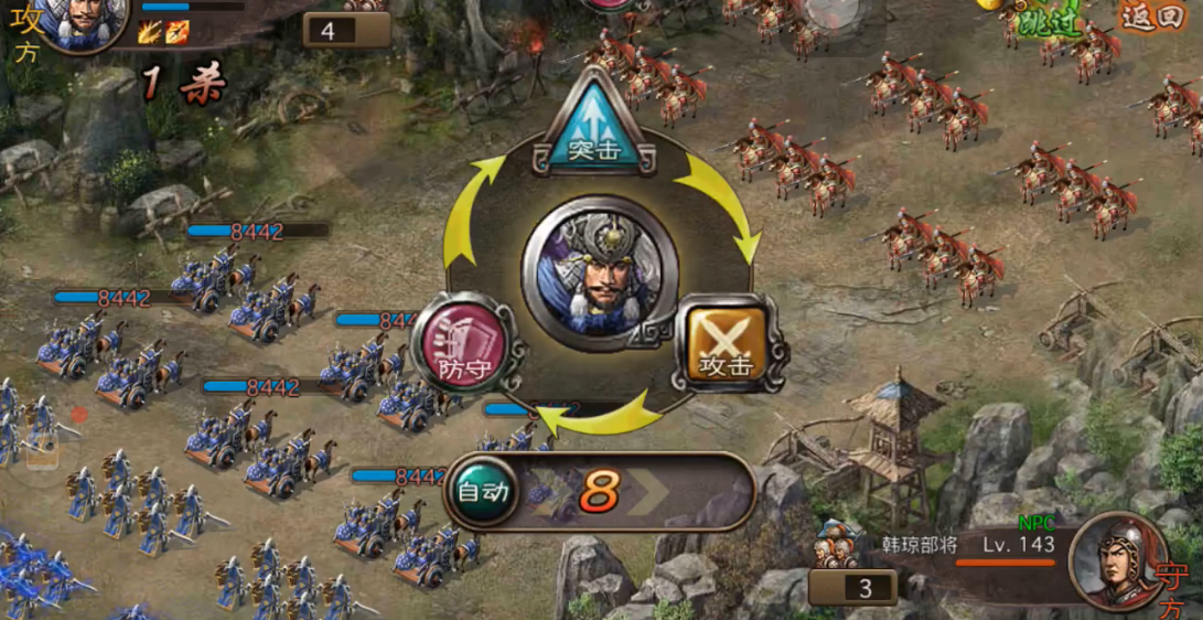 剩下的两排兵力继续防御克制,砍完第三排后,随便补一刀就能打掉韩琼第四排。最后张飞放战法收尾,轻松解决战斗。用典韦换掉太史慈,搭配关羽、周瑜和张飞。这个副本是山地地形,小兵战法不可抵挡且会混乱,每打死一个将还可能触发两次战法,所以咱们要尽量封挡对手的二次战法,或者用护罩保护自己。