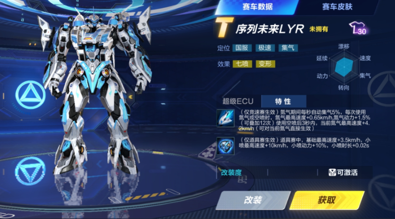 当前游戏中较知名的机甲车包括源极之星EXA、序列未来LYR和孙悟空等。源极之星在竞速赛中通过小喷积累充能,释放氮气时提升速度和集气效率。序列未来则擅长在腾空地图发挥,氮气期间自动集气并增强动力。孙悟空机甲则与赛道加速带互动紧密,能在起步阶段快速获取氮气。每款机甲车都有其专属的ECU技能,能在关键时刻提供爆发性加速。