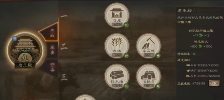 前期必须重点升级农田、伐木场、采石场和冶铁台等资源产出建筑,确保木头、石头、铁矿和粮食的稳定供应。城池建设方面,要优先提升君王殿等级,因为它能解锁更多功能,同时仓库的升级也不容忽视,这有助于积累更多资源来支持后续发展。每天记得利用策书进行屯田,选择等级高的土地屯田收益更好,同时注意控制战损,占领土地时尽量让兵力损耗保持在较低水平,比如打二级地时控制在600兵力左右,三级地1200兵力,这样能有效节省资源用于其他升级。