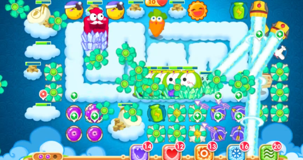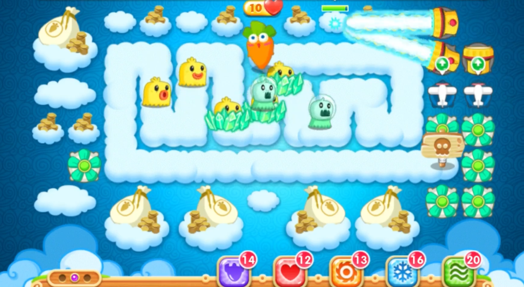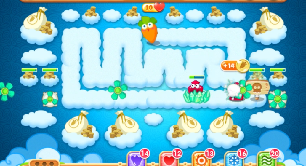 怪物波次本身倒不难,总共就5波,但因为前期你在专心打钱袋,可能会漏掉几个小怪。前几波可以故意放走一两个小怪,好让你的风扇塔能一直攻击钱袋,因为风扇是直线攻击,有时候会被小怪挡住。只要萝卜血够厚,掉一两滴血无伤大雅,换来的却是更快的道具清理速度。打到后面几波,你的炮塔阵已经成型,满屏都是升满级的炮塔,怪物基本上就是出来送钱的,连走到萝卜跟前都费劲。你只需要时不时检查一下有没有漏网之鱼,或者哪个炮塔还没升满级,查漏补缺就行。