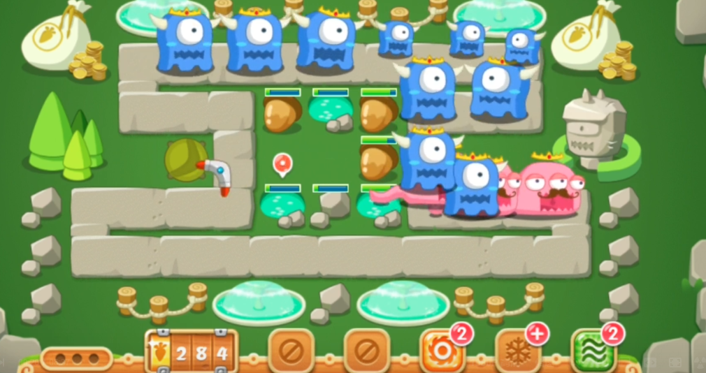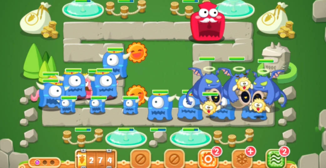 当四个太阳花全部找到后,战略重心应立刻转向经济积累与场面清理。此时不应停下攻击,而是利用已获得的太阳花和其他炮塔,持续攻击地图上的大型钱袋和其余道具,这是达成90秒内获得6000金钱任务的关键。期间需要平衡防御火力与道具清理的节奏,确保有足够的输出应对怪物波次,同时高效地开拓地图区域以获得更多建造位置和额外金币。在清理道具的过程中,可以视情况补充瓶子炮、回旋镖等炮塔来增强火力网。此阶段的核心思路是在保证安全的前提下,最大化金币获取效率,为后续章鱼塔的建造任务储备充足资金。