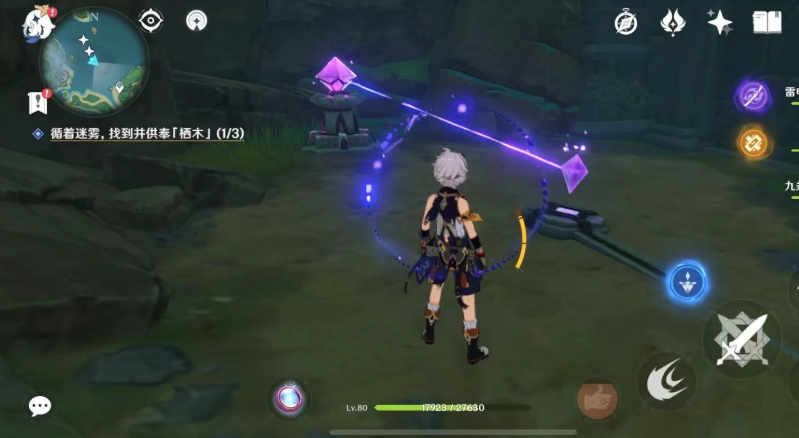 你可能会发现其中一片或多片被紫色的雷电屏障所笼罩,无法直接拾取。这是破解栖木保护罩时常见的一个进阶挑战。应对的关键在于寻找附近的雷种子。通常在屏障周围不远处,会有一株雷樱枝条,靠近它可以召唤雷种子。携带雷种子后,你就能获得临时穿越此类雷电屏障的能力,从而进入其中获取被困住的羽毛。