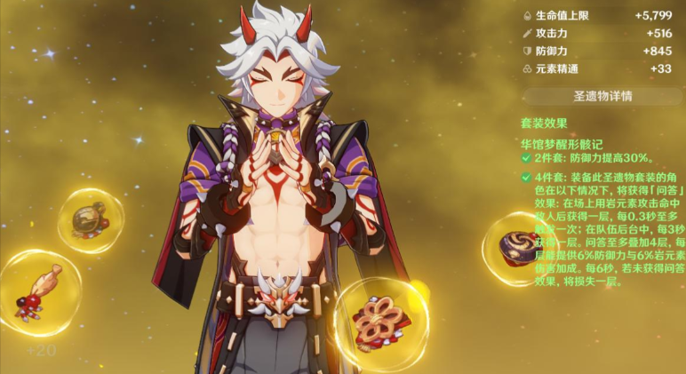 他的毕业圣遗物套装首选是华馆梦醒形骸记四件套。这套圣遗物的两件套效果直接提供30%的防御力提升,非常契合他的需求。四件套的问答或岩护效果则能在角色场上岩元素攻击命中或后台停留时,持续叠加层数,每层进一步提升防御力与岩元素伤害加成,最高可叠加至24%的防御力与24%的岩伤加成。这套装与荒泷一斗的输出机制完美匹配,能显著拔高其输出上限,是其毋庸置疑的毕业之选。