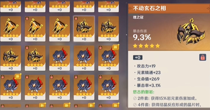 时之沙部位应当优先选择防御力百分比,这是提升其基础攻击转化效率的关键。空之杯部位的最佳选择是岩元素伤害加成,这能直接增益其开大后的所有岩元素攻击;在岩伤杯暂时欠缺时,也可以使用防御力百分比作为过渡。理之冠部位则根据角色的暴击率与暴击伤害面板来决定,优先选择暴击率或暴击伤害,以确保双暴属性的平衡。通常情况下,若武器提供暴击伤害,则头冠可选暴击率,反之亦然。