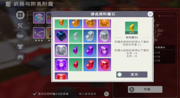附魔系统是游戏中增强装备性能的重要机制,允许玩家为武器和防具添加额外属性。武器附魔可以增加伤害输出或附加元素效果,防具附魔则能提升生命值或防御力。附魔操作需要在附魔台上进行,使用不同类型的附魔石,如火附魔石、冰附魔石或电附魔石,这些附魔石可以通过砍伐特定树木或击杀怪物概率掉落。附魔分为多个等级,高级附魔石需要合成低级附魔石和魔晶资源。