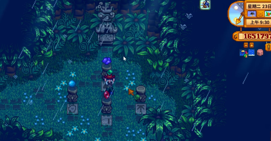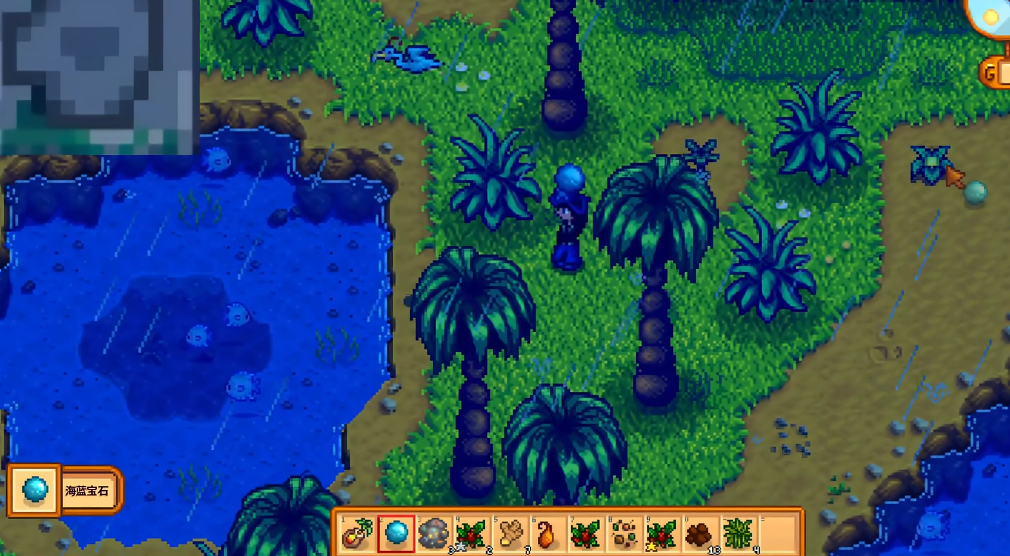 宝石鸟的出现有特定的条件,它们只会在姜岛下雨的日子里现身。每次下雨,东南西北四个方向中会随机有一只宝石鸟出现在对应的固定位置。当你靠近这只受惊的鸟时,它会飞走并在原地留下一颗宝石。姜岛的天气与鹈鹕镇是独立的,有时需要耐心等待雨天的到来,不过你可以通过使用降雨图腾来直接改变姜岛的天气,从而人为创造解谜的机会,这能大大加快任务进度。