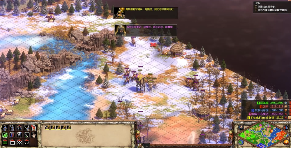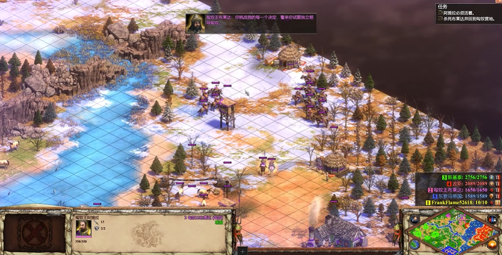 在安全返回营地并获得初始单位后,你的核心任务是快速发展经济,目标是支撑后续的军事行动。你需要派遣村民重点收集木材、食物和黄金,因为匈奴文明缺乏防御性建筑,所以必须在军事保护下快速扩张经济,确保资源链的稳定。一个积极的打法是,在获得渡口对岸的村民和资源后,可以尝试直接连续点击升级封建时代和城堡时代,为迅速建立高级军事建筑做准备,将经济优势转化为时代优势是关键。