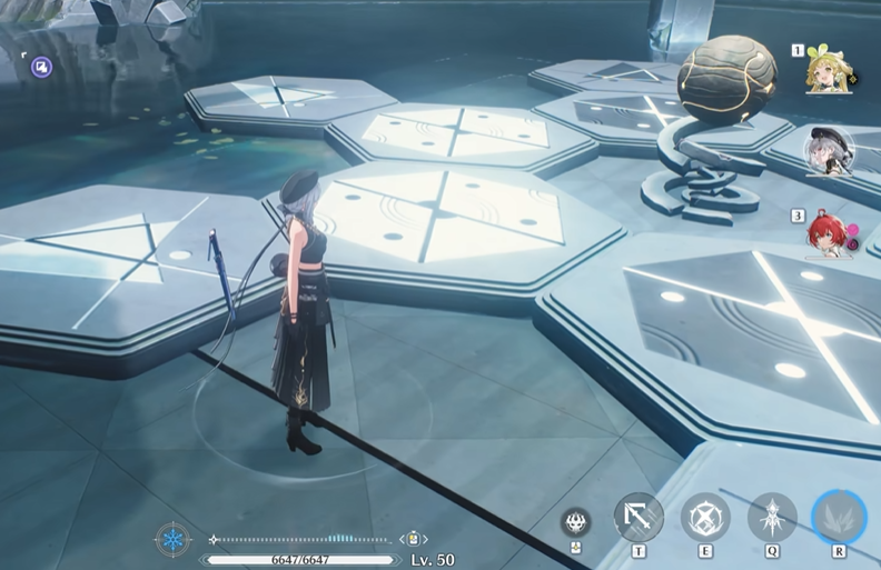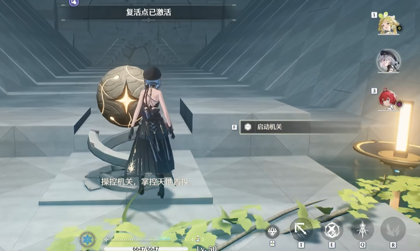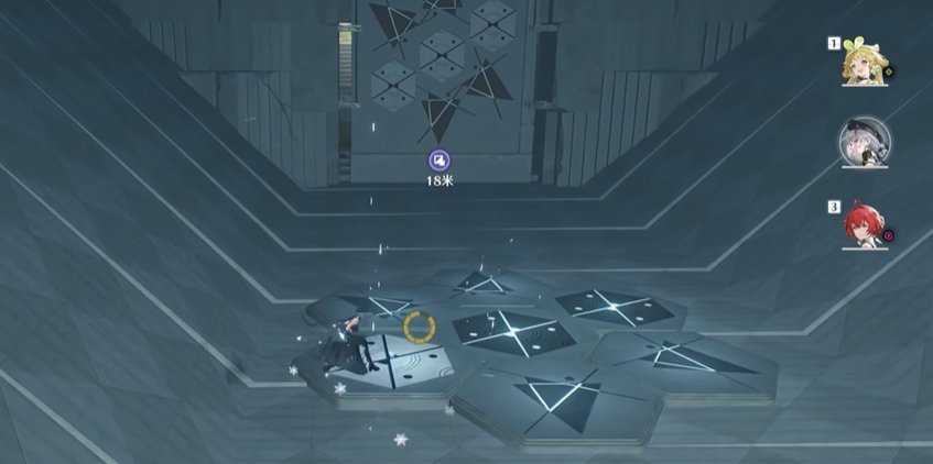 进入副本后,会遭遇第一个解密点,玩家需要观察前方墙上的图案,然后对地面上凸起的白色六边形地砖使用跳起下落攻击(重击),使其颜色变为黑色,与墙上图案一致即可打开第一扇大门。穿过大门来到下一个房间,这里有一个圆球状的交互机关,与之互动并选择逆时针旋转90度,将带有图案的地板旋转至地面方向,接着再次参照前方门上的图案,使用下落攻击依次击打地面中间三块凸起的六边形地砖,将它们全部变为白色,即可开启下一道门并继续前进。