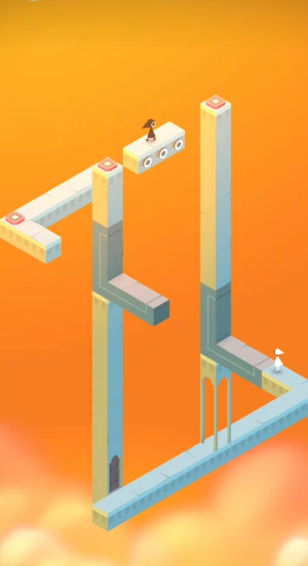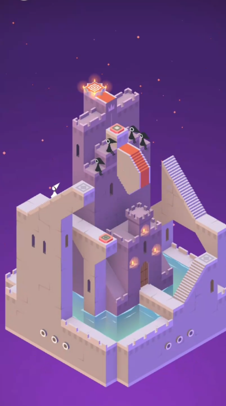 操控底部的粉色大转盘,将整个建筑逆时针旋转,直至转到带有瀑布的一面,此时艾达可直接走到瀑布旁的弯道处。继续微调转盘角度,利用视觉差让弯道与上方的楼梯形成连续通路,引导艾达向上攀爬,抵达建筑顶端的橙色按钮。踩下这个按钮后,会出现一条新的粉色通道,连接至终点区域。