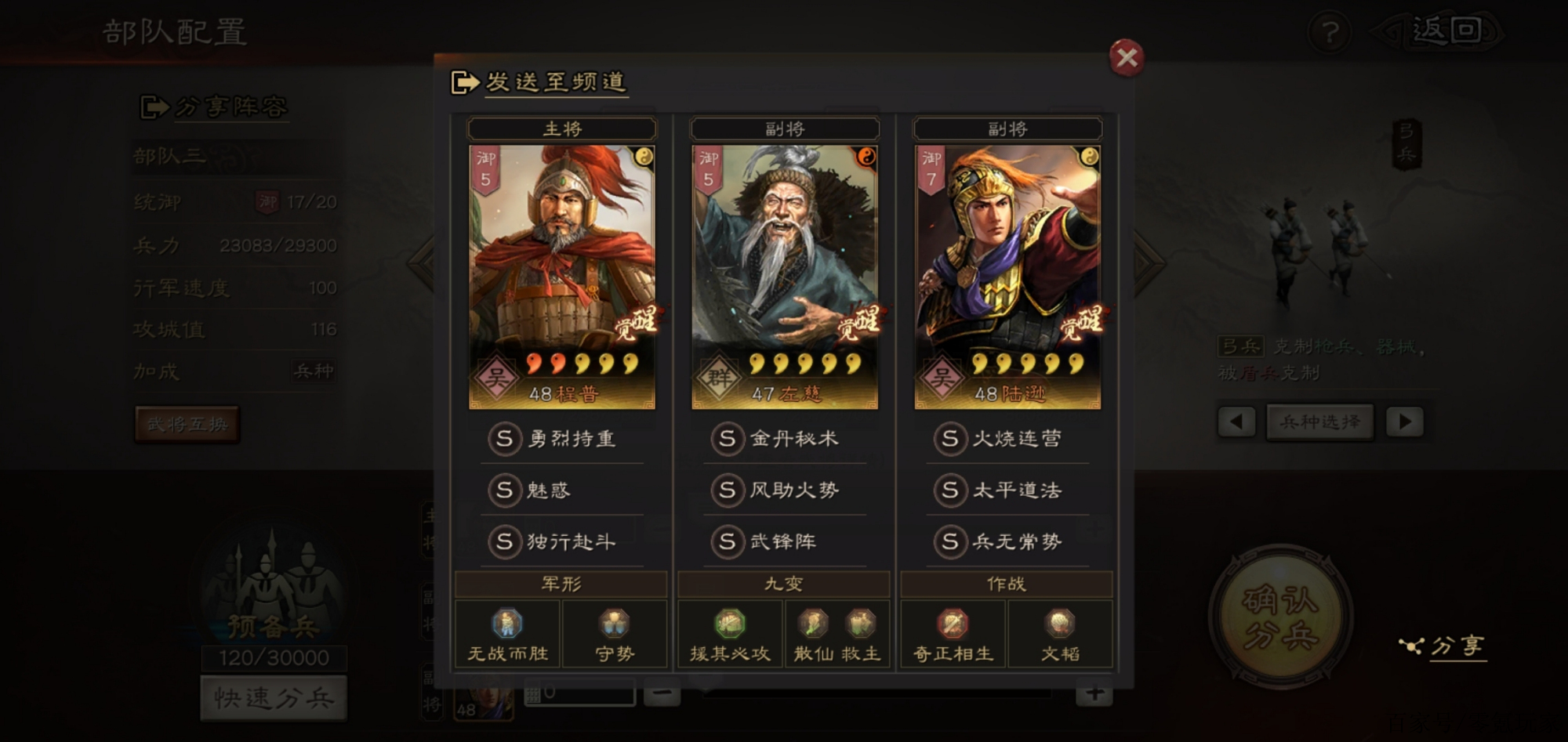 后发制人与千里驰援的组合,适合走反击肉盾流的董卓。千里驰援能让董卓援护友军全体,同时提升自身统率,进一步强化坦度,还能获得反击状态。搭配后发制人后,董卓受到普通攻击时可稳定触发反击伤害,既承担了队伍承伤与保护队友的职责,又能持续补充输出。这种组合下董卓全统率加点,兵书选择防御向配置,可搭配藤甲兵等盾兵兵种战法,面对兵刃队伍时,既能靠高统率与减伤扛住伤害,又能通过反击与自带战法的倒戈维持兵力,第五回合开始还能打出群体伤害,攻防一体的特性拉满。