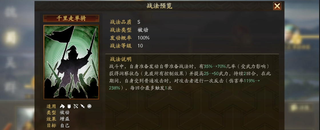 纵兵劫掠满级效果为35%概率瞬发,对敌军单体造成172%兵刃伤害,同时施加震慑状态,使目标无法行动持续1回合。震慑是游戏中顶级控制效果,兼具缴械与沉默双重属性,被震慑目标既无法普通攻击,也不能释放主动战法,能直接打断敌方施法节奏,压制核心输出与辅助武将。该战法伤害与控制兼备,虽发动概率不算顶尖,但瞬发特性让其无需准备回合,可在每回合稳定尝试触发,实战中平均每两到三回合就能生效一次,配合高速度武将佩戴,能抢占先手压制敌方关键角色。