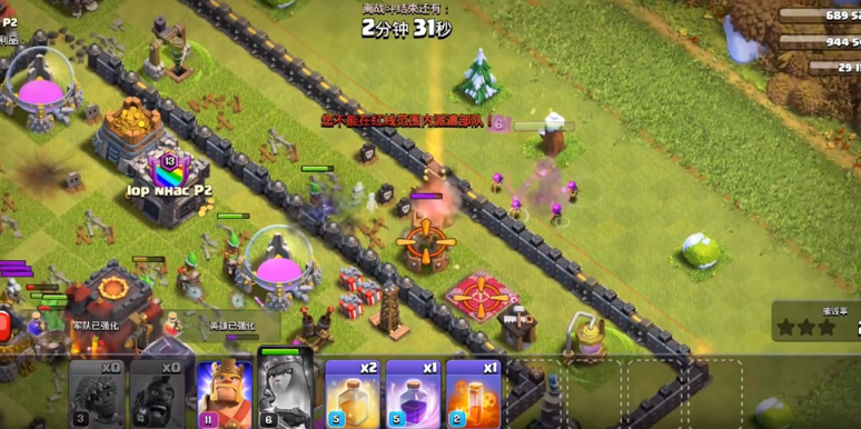 实战中召回多用于天女流救场,天女走偏或陷入重火力包围时,及时释放召回法术回收女王与天使,重新选点部署调整路线,避免核心战力暴毙。搭配超龙、雷龙等空军时,可召回残血部队转场攻击另一侧防空,破解格子阵与分散防御布局。面对多头地狱塔、炸弹塔等陷阱时,能快速回收前排肉盾与输出,减少战损,为后续部队清场创造条件。蝙蝠法术流配合召回,可在蝙蝠陷入密集防御时回收,转至防御薄弱区域释放,提升清边与破阵效率。