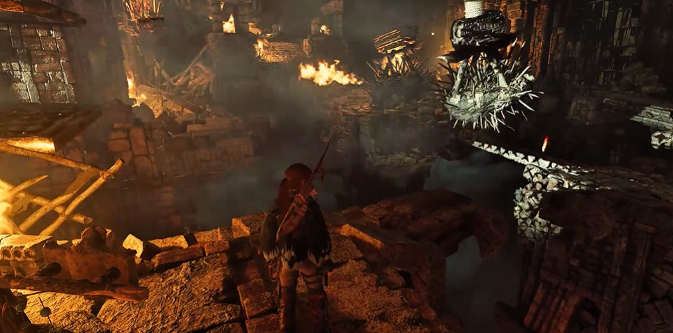 第二个关键步骤在于操控双风口联动系统。拉动第二个转杆会开启中间通道的风口,吹灭阻挡通路的火焰,需从平台右前方精准跳跃至中间通道。中间通道的杂物障碍需要通过绳索箭矢解决——当第一个石摆锤被风吹至最高点时,用绳索箭矢连接摆锤上方的固定桩,借助拉力撞开障碍物。完成操作后需返回关闭第二个风口,否则后续路径无法通行。