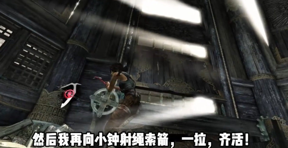 当两侧支撑柱都被撞断后,需要同时打开两扇通风窗。站在钟的正前方,用绳索箭全力拉动钟摆,使其撞击顶部横梁。横梁断裂后大钟会坠落砸穿地面障碍。过程中如果风力不足导致撞击力度不够,可以多尝试调整拉钟角度,确保钟摆摆动幅度最大化。