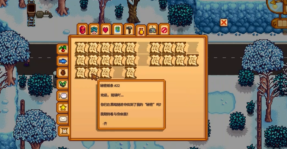 秘密纸条是隐藏着各种宝藏和谜题的有趣收集品,它们不仅能帮你了解村民的小秘密,还能解锁特殊奖励。想要找到这些纸条,你得先完成冬日谜团任务,触发剧情后获得放大镜,之后就能通过砍树、挖矿、钓鱼等方式随机获取纸条了。每张纸条的内容各不相同,有的会告诉你村民的喜好,有的则藏着寻宝路线,仔细研究才能发现它们的价值。