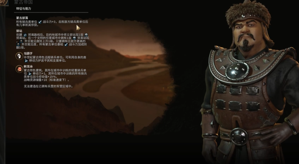 蒙古的特色能力驿站非常关键,它能让你在商路发起时就建立贸易站,不需要等商路跑完。记得尽快和其他文明建立商路,这样能提高外交能见度,只要比对方高一级,所有蒙古单位就能获得双倍战斗力加成。早期建议先造一个商业中心来增加商路数量,同时别忘了军营,它能给骑兵单位提供额外移动力和战斗经验。