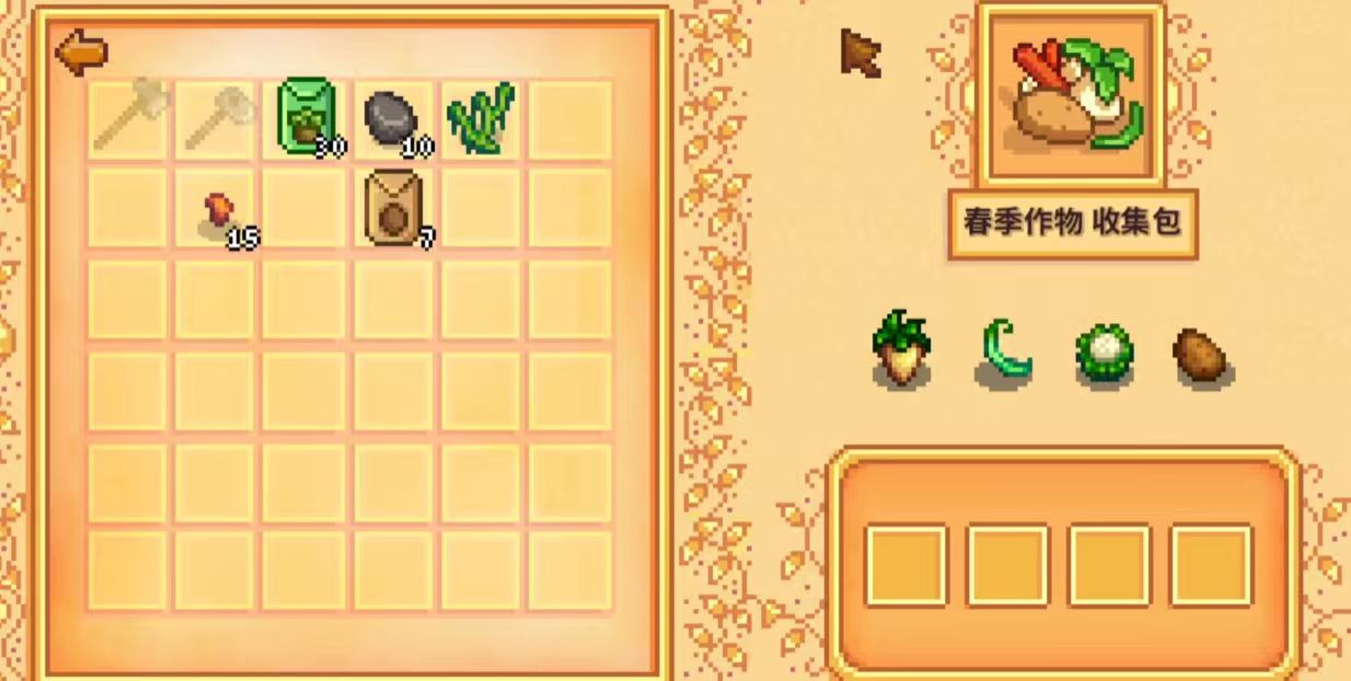 献祭系统分为六个主要房间,按解锁顺序分别为工艺室、茶水间、鱼缸、锅炉房、布告栏和金库。工艺室作为初始解锁区域,需要完成春季至冬季的采集物品包,包括野山葵、水晶果等季节性产物。茶水间要求提供农作物和畜牧产品,如防风草、大壶牛奶等。鱼缸收集包则需提交特定季节和天气条件下捕获的鱼类,例如鲶鱼需在春秋季雨天捕捞。