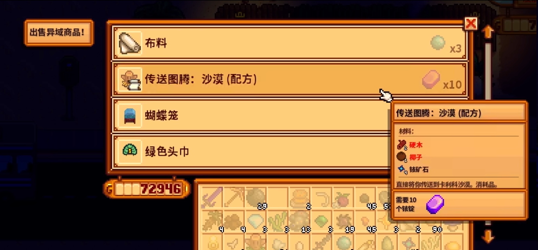 沙漠里还有一些独特的资源,比如椰子和仙人掌果子,可以砍伐椰子树获取木材。沙漠的池塘能钓到沙鱼和蝎鲤鱼,这些鱼是完成社区中心收集包的关键。如果想去沙漠矿洞,记得先在普通矿洞120层拿到头骨钥匙,否则连门都进不去。沙漠的商人和绿洲商店每天都有不同的商品,路过时可以顺便看看有没有需要的物品。