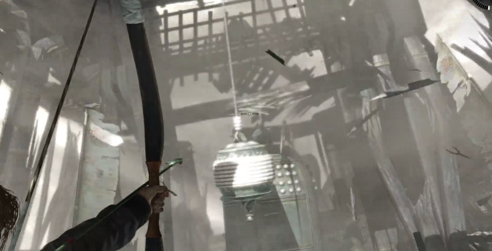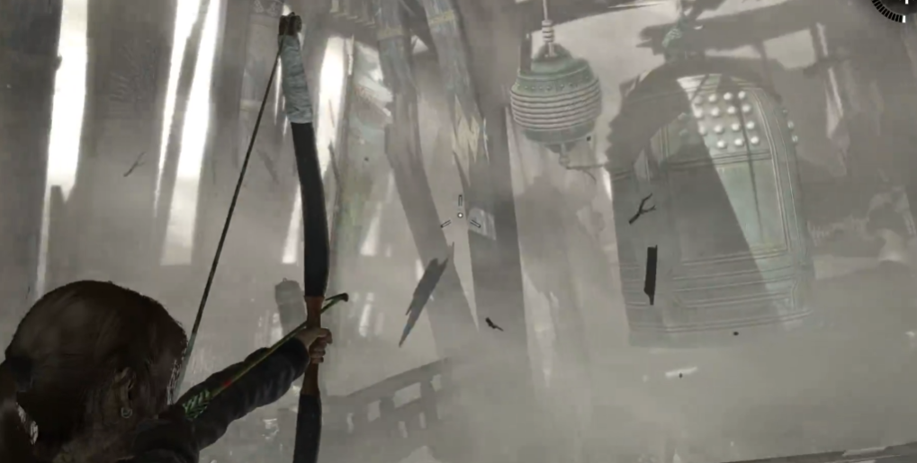 最后一步是同时打开两扇窗户,让风力最大化作用于钟摆。需站在大钟正前方,使用弓箭绳索拉动钟摆,使其以更大幅度摆动并撞击顶部横梁。成功撞击后,横梁断裂,大钟因重力作用坠落并砸穿地面障碍,解谜完成。整个过程需注意时机与角度,避免因操作失误导致钟摆偏离目标。