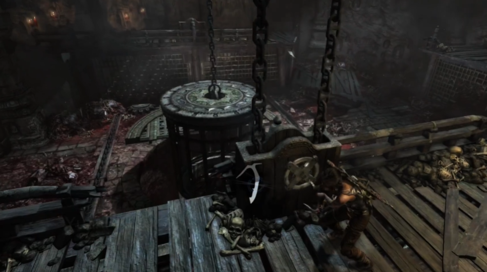 铁笼解谜的核心在于分阶段操作机关。首先需确保铁笼处于合适高度,通过左侧轮盘关闭地井盖,再通过右侧轮盘降低铁笼。随后需攀爬至三层平台,此处需注意利用环境中的短梯或木板,部分路径需通过求生本能视角高亮提示。到达三层后,对准铁笼白色标记区域发射绳索箭矢,将其拉向玩家方向,并在铁笼接近时迅速跳上顶部。