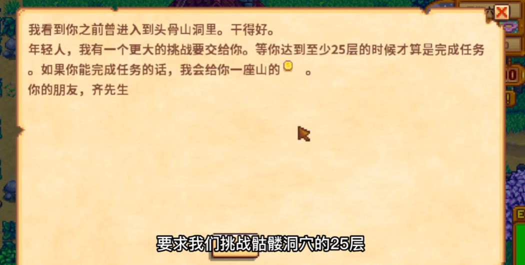 星露谷物语头骨山洞25层任务是游戏中的一个重要挑战,玩家需要在沙漠矿洞中深入探索并完成齐先生的任务。该任务要求玩家从头骨山洞的第1层开始,逐步向下推进至第25层,成功到达后将获得10000金币的奖励。头骨山洞位于沙漠西北角,初始处于锁定状态,玩家需修复公交站并获取头骨钥匙才能进入。钥匙可通过普通矿洞120层获得,修复公交站则需完成社区中心金库收集包或直接购买巴士服务。