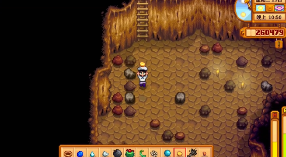 头骨山洞的探索机制与普通矿洞类似,玩家需在每一层寻找梯子或洞口以进入下一层。梯子可通过破坏石头或击败怪物生成,洞口则能随机跳过3至15层,但跳跃会损失生命值,数值为跳过层数的3倍,最低保留1点生命值。由于头骨山洞没有电梯保存进度,每次进入都需从第1层重新开始。建议携带充足的食物、炸弹和楼梯以提升效率,炸弹可快速清理障碍物,楼梯能直接跳过复杂楼层。