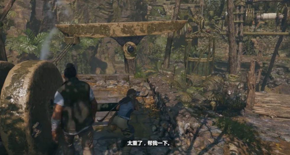 如果吊桥被水挡住,先找到附近的水塔或排水装置。爬上水塔顶部打开排气阀,让水流发生变化。返回底部和同伴一起推动石轮机关,把水导入绿色容器。注意绿色容器可能有破损,操作要迅速,水位变化后吊桥会露出可互动部分。
