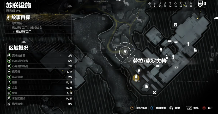 该区域存在多个挑战任务,例如档案损毁要求破坏指定电脑,位置包括火车站附近的小木屋、水道尽头的箱子等。部分收集品如背包、地图和独石碑需完成古墓挑战才能获取,铜矿工厂阁楼的地图临近古墓入口,需攀爬竖梯取得。求生储藏点和钱币储藏点分散在隐蔽角落,例如水下通道或需要宽头箭攀爬的平台上,建议开启生存本能高亮提示。